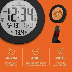 Marathon Round Atomic Alarm Clock With Push-Button Backlight, Indoor Temperature & 8 Time Zones