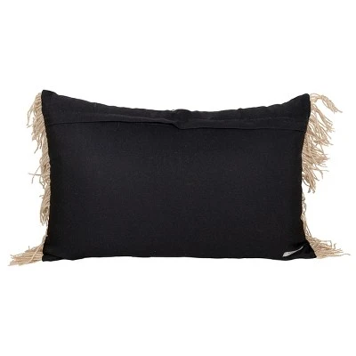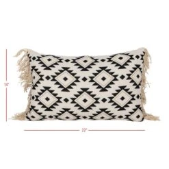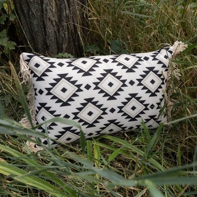 Infuse a southwest vibe to your space with this lumbar pillow exclusively from Foreside Home and Garden. A bold black geometric pattern is printed over a light tan base, finished with textural tan fringe on the edges. Classic black and white accented with tan is a neutral and transitional color palette perfect for layering. Made from recycled plastic bottles and UV stabilized, this lumbar pillow is suitable for both indoors and outdoors.