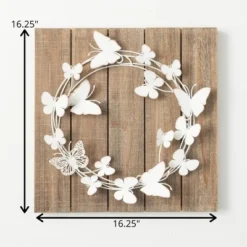 An everlasting statement piece, the wooden plank panel creates the perfect backdrop for this intricate wreath-shaped wall sculpture. Honoring nature in metallic form, artisans have hand-sculpted this beautiful crown of fluttering antique white butterflies. Over the last 55 years, Sullivans has become an industry leader in home decorations. Our brand is rooted in tradition while incorporating modernized trends to keep your home looking up to date with timeless style. Here at Sullivans, we pride ourselves on creating product designs focused on quality and value, ensuring that our customers have access to beautiful products at reasonable price points.