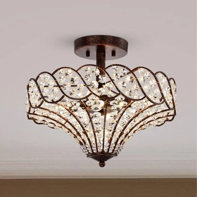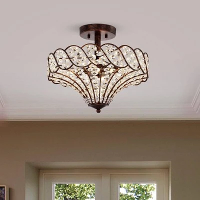 Give your home a new and improved look with this beautiful semi-flush mount chandelier. Featuring a rustic bronze finish and encrusted crystals around the abstract shade, this fixture provides ample illumination and adds a vintage flair to your decor.
