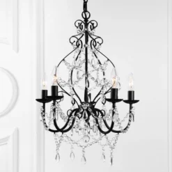 You’ll love this chandelier’s cascade of clear crystal hanging accents and classic ironwork finished in a matte black. The draping of beads adds a magical touch to this elegant light fixture, which boasts a classic silhouette reminiscent of the antique chandeliers collected in Paris antiques markets. The chain is adjustable prior to installation, allowing the drop to range from 26.5″ to 98.5″ from ceiling to the base of the fixture.