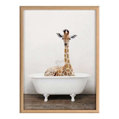 Get ready for bathtime with this little baby giraffe friend! Framed in a sleek modern frame, this contemporary design is the perfect art piece to add to your home decor collection. Printed and framed in the USA in Waunakee, Wisconsin, this printed glass art will be a pleasure to look at every day in your living room, bedroom, office, or any room in the home. This print also makes an excellent gift for a birthday, holiday, or house-warming. It also has two hangers already attached for easy wall display. The outer dimensions are 24 inches by 18 inches. Print name: “Giraffe 2 in Tub Color”