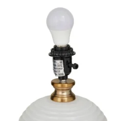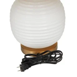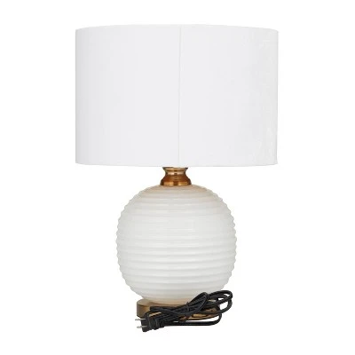 This eye catching lamp makes a charming and chic addition to your surface space and beautifully illuminate its surrounding area. Bring a finishing touch to your home with an inviting appeal with this accent table lamp. A white glass table lamp that brings charm and a modern appeal to any room for an instant decor upgrade. Designed with black stopper at the base that prevent sliding around as well as scratching any surface. Comes with 1 socket for medium-sized E26 bulbs. Bulbs included. This item ships in 1 carton. Cord length measures approximately 60″. Suitable for indoor use only. An accent piece featuring a white drum-shaped shade. Power cord on/off toggle switch. Modern Inspired.