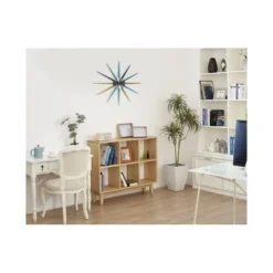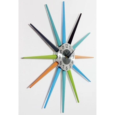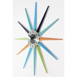 The sunburst design of the Stellar Wall Clock can be used to liven up space in your den, living room, or bedroom with its aesthetically pleasing colors and design elements! Traditional sunburst clocks in gold and silver may soon be passé, we give you the ticket to the future! Spanning 20 inches, this midcentury modern inspired clock is surrounded by solid wood spokes in complimenting colors. The clock face is a silver with black metal hands and black numbers. The open face or no lens concept only adds to its loveliness. As creatures that thrive in the sunlight, it’s no wonder we are captivated by the shape of the sunburst. With rays spectacularly beaming from the center, the accentuating shape is sure to look sharp as a hallway mirror or mixed and matched with beautiful eye-catching décor or other smaller pieces.