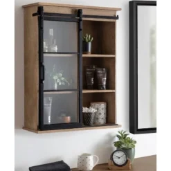 Organize your home while elevating its rustic decor aesthetic with the modern design of the Barnhardt cabinet. This farmhouse-inspired storage cabinet features a careful blend of solid and manmade wood with a distressed finish. What defines this piece, however, is its metal framed sliding glass door, separated into refined windowpanes for an extra chic edge. The Barnhardt wall cabinet also features plenty of storage capacity, with separate shelves with dimensions measuring 9.75 inches wide by 5.75 inches deep. Use these shelves as a makeshift vanity medicine cabinet to store toiletries in your bathroom, mugs or spices in your kitchen, or use them as a small display case in your living room or entryway. It can even be a catch-all by your doorway for keys and small items you can’t leave home without. Each Barnhardt cabinet hangs in a matter of seconds with convenient metal Z-brackets. The Barnhardt cabinet with its barn door detail is ready to use as decorative, modern farmhouse wall shelves and storage.