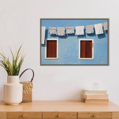 ART DESCRIPTION: A clothesline filled with whitish tee shirts and towels arcs across the side of a blue stucco house. The shadows of the Hanging Laundry show dark against the wall, just above two windows that are not quit twins. This Amanti Art canvas art print was created by Brenda Tharp Danita Delimont and printed by Amanti Art in Madison WI. The canvas is stretched by hand and finished with a float frame. Individually made using traditional custom framing techniques, it has the quality you would expect from your local frame shop. Because of our attention to detail and focus on artistry, architects, interior designers, and homeowners alike choose this framed canvas artwork to create beautiful living spaces.
