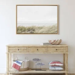 Imagine yourself in this beautiful coastal beach with this print by Amy Peterson. Framed in the USA in Waunakee, Wisconsin, this floating canvas art will be a pleasure to look at every day in your living room, bedroom, nursery, or any room in the home. Printed on gallery-wrapped canvas and framed with a lightweight polystyrene frame, this wall art has two hangers already attached to the MDF back for easy wall display. The outer dimensions are 33 inches tall by 23 inches wide by 1.63 inches deep. Print Name: “East Beach”