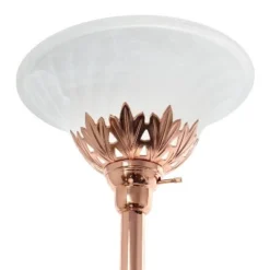 Light up your bedroom, office, foyer or living room with this elegant yet affordable 3 light floor lamp. It features a stunning rose gold finish and marbleized white shades with spiraled cut glass to complete the timeless look. Item is also available in a number of different metal finishes to compliment any room!