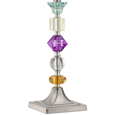 Contemporary lamps add a fun look to your decor. This stylish table lamp comes from the 360 Lighting brand, and was inspired by bright geometrics and trending decor colors. It features a multi-colored stack of acrylic shapes on the column, with a square base and a lively purple fabric lamp shade on top.