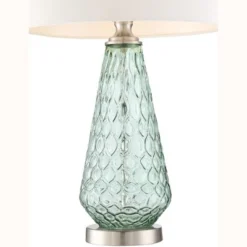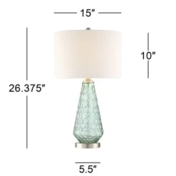 From the talented artisans at 360 Lighting, this modern table lamp is crafted from light seafoam green glass with a translucent quality, featuring a textured pattern of whorls and rounded diamonds. Brushed nickel finish accents and an off-white drum shade add a clean, classic touch. Offering a lovely look for your home, this glass table lamp is perfect for contemporary and coastal style settings.