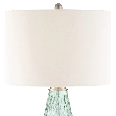 - Textured sea foam green glass body. Brushed nickel finish accents. Off-white drum shade.