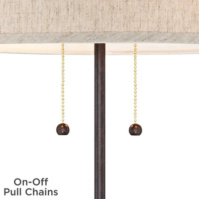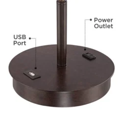Perfect for a side table or end table, the design features two on-off pull switches for easy control. The slim profile sits on a round base with an integrated USB port and an outlet utility plug for superior convenience. A drum lamp shade sits on top. The table lamp with outlet design is ideal for a work area or for bedside use.