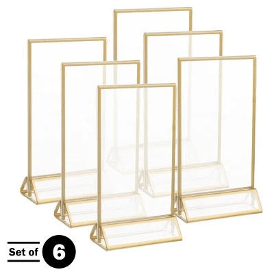- PICTURE FRAME 6-PACK – This 4-inch by 6-inch acrylic sign holder set is perfect for displaying menus, table numbers, photos, or creating custom centerpiece table decorations. These gold frames will add an elegant touch to any display.