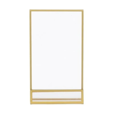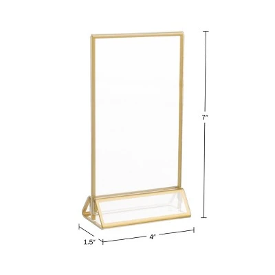 Display photos, wedding table numbers, or tabletop signage with the chic Gold Picture Frame 6-Pack by Great Northern Party. Each elegant 4×6 picture frame sits on a vertical stand and has a double-sided display that is perfect for showcasing menus or table numbers from any angle. This versatile sign holder set can also be used for photos, artwork, or creating custom décor using pressed flowers. The durable acrylic and metal construction ensures you can reuse these picture stands for display again and again