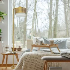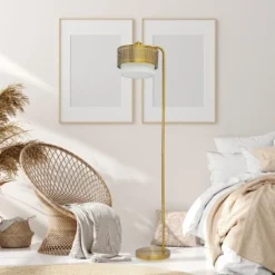 This 65.25″ H Ximena Gold Drum Shade Floor Lamp from River of Goods offers a luxe lighting option that pairs well with modern or transitional decor. This floor lamp showcases a gold-finish metal candlestick base and a two-piece drum shade featuring a white fabric piece and gold-finish metal piece with cutout detailing. The lamp requires one 60-watt E26 bulb (not included) to cast a soft, warm glow, and the 90-inch cord with a foot switch allows for versatile placement in any room.