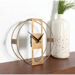 Add some personality to your space with this fantastic desktop clock from Kate and Laurel. The Urgo tabletop clock features a modern design inspired by minimal aesthetics, making it feel complementary to your decor rather than a piece of clutter. The clock itself is numberless, with a round shape and an elegant gold finish. The Urgo’s simplistic design looks great in any space, whether you decide to keep it in your office, living room, entryway, kitchen, bedroom, or dining room. Use it as a decorative accent on a side table, a minimalist mantle, or a chic centerpiece for your next event! The round clock’s diameter is 8 inches, with a 2.5-inch depth that allows it to sit flat on any surface in your home. This clock’s functional design means that it requires one AA battery that pops into the back, making it ready to give you the time at any point of the day. Once the battery is taken care of, your clock is ready with no other assembly required! Revamp any space in your home with a futuristic look thanks to the modern sophistication of the Urgo tabletop clock.