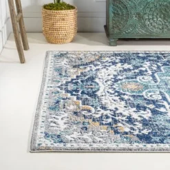 The diamond-shaped medallion in the center of this rug’s design recalls vintage geometric rugs. An updated color scheme adds a modern twist to a classic design. With its Bohemian-inspired design this versatile rug would be perfect for a dining room, living room, kitchen, bedroom or porch.