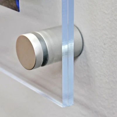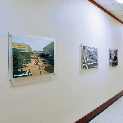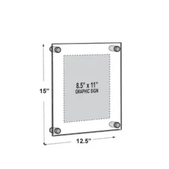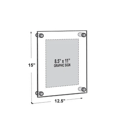These classy one-sided Wall Mount Floating Frames are ideal for displaying artwork, photos, posters or branding in your office, home or at an event. These clear double panel floating frames with silver caps are strong, stable, as well as easy to clean and maintain. The innovative design holds your artwork or picture in place without it moving or slipping at all. Add elegance to your professional environment with Azar’s clear acrylic gallery frames with silver satin aluminum caps and standoffs. Frames can be used vertically or horizontally. Each floating sign holder frame set includes 2 acrylic panels that are 3/16 thick, 4 silver standoff caps and hanging hardware. Note: Large format sizes: 24 x 36 and 30 x 40 include 6 standoffs and caps. Easy to change the sign or photo, simply unscrew the front silver cap and switch out the graphic. There is no need to remove the frame from the wall once it is affixed. The edges are flame polished giving these floating picture holders a high end finish with a touch of fancy. Hang these beautiful acrylic frames in boutiques, museums, trade shows, hotel lobbies, restaurants, retail stores, schools, at work or at home. Sold in Multiples of 1. Sold in Multiples of: 1 Material: Acrylic (3/16 thick) Frame Orientation: Portrait/Landscape Poster Measurement: 8.5 x 11 Overall Frame Measurement: 12.5 x 15 Includes: Four 1 SILVER diameter aluminum standoffs and caps, and four all purpose screws with anchors. (Gold Cap Hardware can be purchased as an add-on item.) Color: Clear
