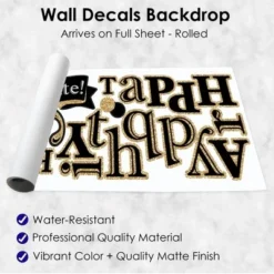 Adult 50th Birthday – Gold Wall Decals Backdrop includes 1 sheet of vinyl wall stickers that include letters and shape pieces that form the perfect Happy 50th Birthday backdrop for your Gold Birthday Party. Wall Decal sheet measures 50 inches wide by 16.5 inches tall. Pieces range in size from 26.5 x 5.75 inches to 3.25 x 3.75 inches. Effortless Decor: The Adult 50th Birthday – Gold stickers are an easy DIY party decoration that will make a big impact at your celebration. Stick them on a flat wall surface to create that picture-perfect setting and then grab your camera to capture all the fun. Easy to Use: Adult 50th Birthday – Gold vinyl decals are easy-to-peel and repositionable. Wall art stickers will adhere to various surfaces including painted walls, plastic, wood, glass, and metal. To use, make sure your surface is clean and dry. Slowly peel the sticker from the paper to avoid tearing and smooth over with your hand. They are also easy to remove, leaving no residue. High-Quality Supply: Adult 50th Birthday – Gold wall stickers come with a quality matte finish and vibrant colors. They are printed on water-resistant professional quality material and will arrive on one full sheet rolled. Made In The USA: Adult 50th Birthday – Gold Wall Decals are designed and manufactured at our Wisconsin facility using materials that are Made in the USA. Adult 50th Birthday – Gold Vinyl Stickers uses a No-Mess Glitter Print: Our vinyl stickers are designed with a printed image of glitter, eliminating glitter flake while maximizing bling effect!