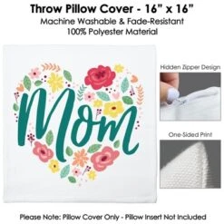 We Love Mom Pillow Cover INCLUDES 1 polyester fabric material pillowcase approximately 16 in x 16 in with a hidden zipper design. Excellent for your next Mother’s Day Party or as everyday decor. One-sided printing only; the backside of pillow cover will be white. Pillow insert not included. COZY COMFORT: Soft and comfortable, the pillow cover is gentle and made of durable material with a canvas-like texture. Fade-resistant and easy to care, the Colorful Floral Happy Mother’s Day pillow cover is great for home decoration and relaxation. EFFORTLESS DECOR: Elevating your home style is easier than ever. With vivid colors and polished design, the pillow cover adds harmony to your space with no fuss. It’s the perfect accent for your sofa, couch, bed, or other indoor furniture. HIGH-QUALITY: Mom’s Day Pillow Cover is professionally printed on 100% polyester material. To ensure long-lasting color vibrancy, machine wash warm. Do not bleach, tumble dry, or dry clean. Warm iron inside out. PRINTED IN THE USA: Colorful Floral Happy Mother’s Day Home Decorative Throw Pillow Cover is designed and manufactured at our Wisconsin facility using materials that are Printed in the USA – Pillow Cover Fabric Made in China.