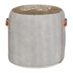 A rustic round pouf that combines style and comfort. Make a bold statement by placing in the entryway, lobby, living room, or home office. This item ships in 1 carton. Suitable for indoor use only. This item ships fully assembled in one piece. Maximum weight limit is 100 lbs. Made in India. This is a single brown colored foot stool. Rustic style. A round pouf showcasing “Mountain are calling and I must go” and “Product of the heart” typographies.