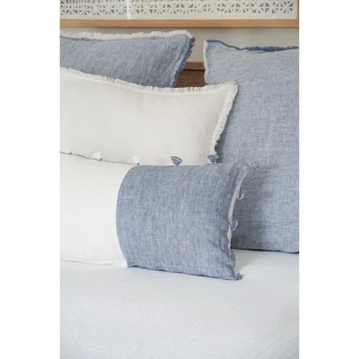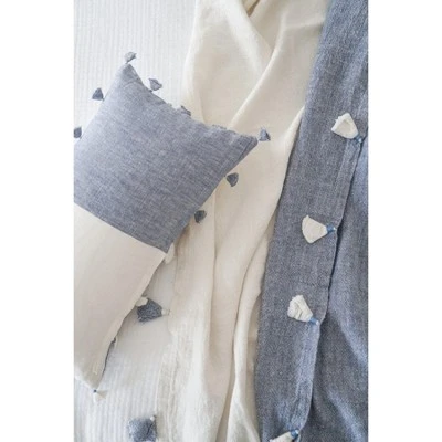 The Chambray Blue Tassels So Soft Linen Pillow is Soo soft- you won’t believe it’s linen! 100% Linen featuring a colorblocked pattern and blue/white tassels. Pillow Cover Only.