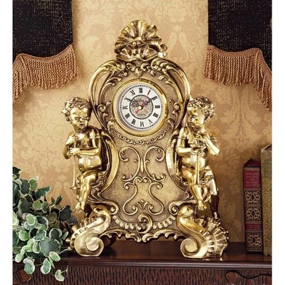 In a traditional dance of ribbon garland and shell foliate ornamentation, putti with pan pipes herald the classic Rococo styling of this period work of decorative art. Our quality quartz clock with Roman numerals is cast in designer resin and finished to replicate the highly polished brass original. 13″Wx7″Dx19″H. 18 lbs.