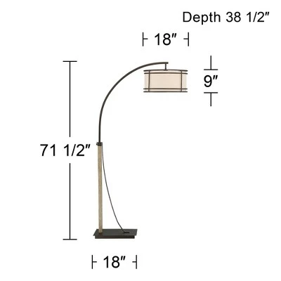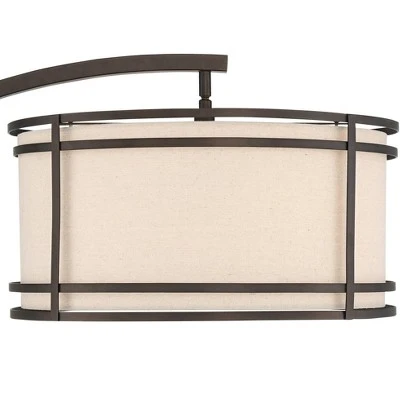 From the Franklin Iron Works brand, this two-light floor lamp is a great addition to a bedroom or living room space. It comes in a metal downbridge frame, covered in an oil-rubbed bronze finish with faux wood finish accents. An oatmeal drum shade hangs from the top, supported by a minimalist metal cage design.