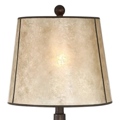 - Aged bronze hand-finished base. Cast resin construction. Mica lamp shade. 8-foot long cord.