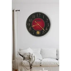 - Antique Design: Its colors alone set it apart, but there’s more to this dramatic wall clock than meets the eye. The Moment in Time antique dial features a wrought iron frame, while a peephole at the “6″ numeral reveals an eye-catching pendulum finished in antique brass. The opening is trimmed with warm charcoal bezel and features a protective glass covering. With its medley of gold, maroon, and black hues, along with its gold-tone spade hands, this timepiece serves as the perfect statement piece for any revamped space.