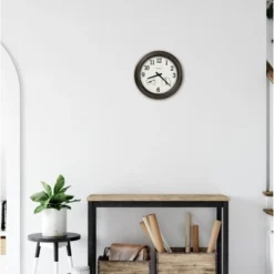 - Premium Luxury: Few metal wall clocks evoke splendor as this piece. Its 18-inch diameter makes it just the right size for a patio or a deck, but it’s versatile enough to add to an indoor space, too. The metal is finished with oil-rubbed bronze, lending it a noble appearance. The dark hue provides a contrast for the off-white center dial, which features black Arabic numerals, a temperature thermometer, and a hygrometer to measure humidity levels. The black hour and minute hands make it simple to tell the time at a glance.