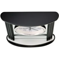 - This handsome wood and glass alarm clock features contoured sides, with wood top and base in a black satin finish. Satin silver-tone plates accent the top and base.