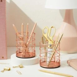 - Rose Gold Pencil Holder: Decorative, classy, and functional, use each pencil cup to add to your office decor to hold pens, markers, highlighters, scissors, or pencils