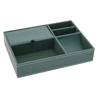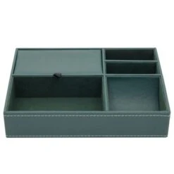 Keep your phone, wallet, keys, cash, and sunglasses organized and easily accessible in this green leather catchall tray. The 5-compartment dresser top organizer measures 10 x 7.3 x 2 inches, perfectly sized to hold your reading glasses, watch, and jewelry. The high-quality faux leather will instantly elevate any bedroom, bathroom, or kitchen while simultaneously ensuring your everyday essentials are all in one place. This modern bedside countertop organizer will be a perfect gift to your love ones, friends and family on birthdays or any occasions.
