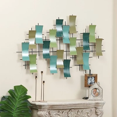 This distinctive all-metal abstract wall decoration brings a modern fashion to any space. The wall decor is handcrafted using high-quality iron material and hand-painted in multiple soothing tones for an elegant style. It is a beautiful artistic statement for any living space in your home. With its abstract geometric design, the modern wall decor is a luxurious modern piece of art. The colors are teal green, aqua blue, and gold-brown in various complementing shades. This wall art is a generous 28.75 inches x 44 inches and includes the wall mounting hardware making it easy to hang horizontally or vertically. It completes the look of any modern, contemporary, or mid-century modern-style living room, bedroom, dining room, or office.