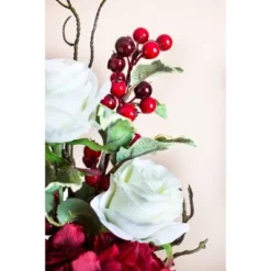 Here’s an explosion of holiday color and cheer. This beautiful arrangement combines pine sprigs, hydrangeas, orchids, leaves, berries, colorful blooms of varying color, and even a pine cone and some sprigs. It’s all lovingly packed into a beautiful decorative urn that will look great on your holiday table, mantle, office reception area, or anywhere else. Plus, it needs no water, so it’ll look fresh and vibrant for years.