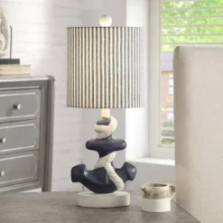 A classic shape turned nautical, this themed table lamp exudes coastal charm. The polyresin base presents a detailed anchor, the blue and white finish emphasizing the naval style. The drum shade matches the finish of the body, with blue and white striping throughout the linen. Above, a small glass sphere serves as a stylish finial. This piece exemplifies superior product design and great styling. It will pair well with classic styling. If you put it in the bedroom or family room, this table lamp stands out. Suitable for residential use in a dry location. Due to lighting and monitor differences, actual colors and finishes may vary slightly from what appears online