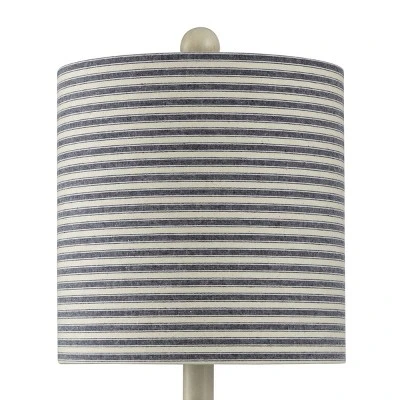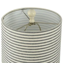- Lamp Shade Is Blue And White Vertical Stripped And Is A Drum Shape.