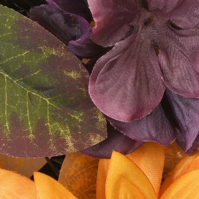 This decorative wreath features large sunflower blooms sprouting from a swirl of leaves in relaxed pastel colors. Hydrangea flower blooms create complimenting color while clusters of berries add a rustic natural appeal. A thick, tightly woven branch ring provides a sturdy base. Display this colorful autumn accented wreath on doors, walls and windows in indoor or covered outdoor locations.