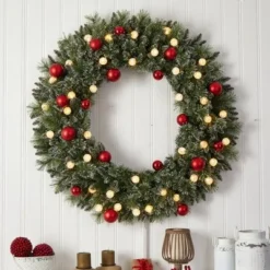 Update your favorite seasonal accents and add some curb appeal to your home or office entrance throughout the holidays with this artificial wreath intricately designed from rich, foliage in bright evergreens, handsomely accented throughout with ornaments. Great for seasonal display, this 4ft. (in diameter) decorative faux wreath makes for an inviting accent and will undoubtedly transform any home’s front-door appeal all throughout the season. Artificial wreaths are manufactured using synthetic materials, such as polyester material or plastic, and are well designed and constructed to be life-like in appearance. This item will need to be re-shaped when removed from the secure box to allow it to reach its fullest size. Your wreath will look beautiful for years to come; simply wipe clean with a soft dry cloth when needed.