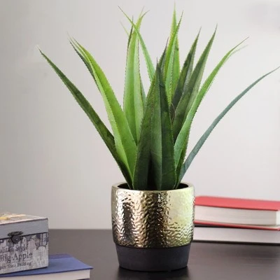 Want to brighten up your space with greenery, but held back by your brown thumb? Not to worry! Show off your love of plants with this beautiful, intriguing artificial succulent. Held in a lovely silver pot with faux dirt for a realistic look. Easily maintained, this artificial succulent is perfect for your home or office. Product Features: Extremely realistic plant is nestled in a gold plated, dimpled, ceramic potPlant is set in “faux dirt” for stabilityDeep green in color, this plant brings life to any decorOverall dimensions: 17″ high x 16″ diameter (at widest point)Pot dimensions: 5″ high x 6″ top diameter x 4.5″ bottom diameterMaterial(s): ceramic/plastic