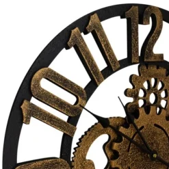 This unique clock is designed with block numbers and accented with cogs. A great wall piece for an industrial decor design. You don’t have to worry about electric cords since it is battery-operated.Product Features:Gold and black round wall clockFeatures block numbersBlack hour and minute handsDesigned gold and black cogsRequires (1) AA battery, not includedRecommended for indoor or outdoor useDimensions:24″H x 24″W x 1.5″DMaterial(s):MDF/plastic/metal