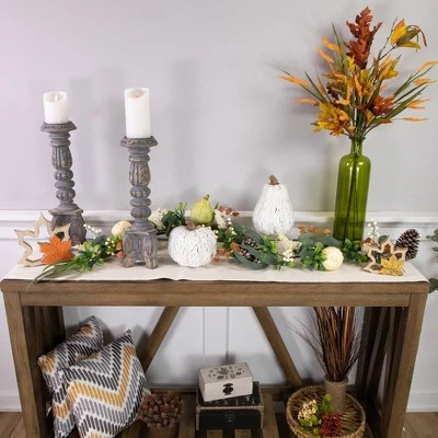 Bring the beauty of autumn indoors with this artificial Fall harvest garland. Perfect for adding a touch of seasonal charm to your home, this garland features a mix of lush green foliage, delicate vines, and realistic gourds in various shades of green and beige. Whether draped across your mantel, hung on your staircase, or used to decorate your Thanksgiving table, this garland is sure to impress.Product Features:UnlitAccented with mixed foliage, berries, gourds and pine conesBendable wire center allows you to shape the garland any way you desireFor indoor use onlyDimensions: 5′ long x 6″ wideMaterial(s): pine cones/polyester/wire/foam/twigsNote: Branches are compressed for shipment, and need to be fluffed out upon arrival to look like the photo.