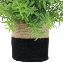 Brighten up your home or office space with this mini artificial spring foliage plant! Featuring a fabric bag base with a stylish color block design of beige and black, this faux plant can be displayed in any room. The lush green leaves are intricately designed to mimic the look and feel of real foliage, bringing the freshness of spring indoors all year round. Perfect for those who love the beauty of nature but don’t have the time or space to care for live plants, this artificial foliage plant is a low-maintenance and long-lasting option. Add it to your decor today to create a fresh and inviting atmosphere.Features:Artificial spring foliage plantNestled inside of a beige and black fabric baseGreen foliage is attached to foam base inside potIndoor use only Dimensions: 8″ high x 9″ diameter (approximately)Pot dimension: 3.5″ high x 3″ diameterMaterial(s): plastic/burlap/foam