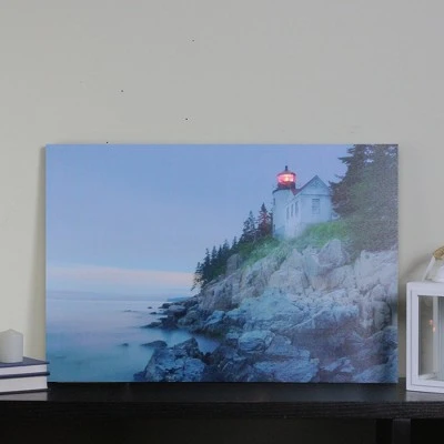 Depicts a cozy home on a rocky coast line of the water with a lighthouse gleaming The lighthouse is illuminated from behind the canvas by 1 LED lights Comes ready-to-hang with hooks on the back Convenient on/off switch on the side Requires (2) “AA” size batteries – not included For indoor use only Dimensions: 15.75″H x 23.5″W x .75″D Material(s): canvas/wood/MDF (medium-density fiberboard)