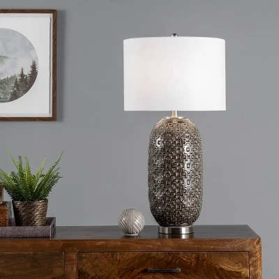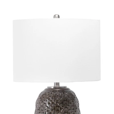 Top off a side table with a decorative traditional style table lamp. A 30-inch tall ceramic cylinder base will fit easily onto your table, desk, or nightstand. A simple fabric drum shade pops on the top of this lamp easily, creating a balanced look with diffused light. A rug pad is recommended to prevent slipping.