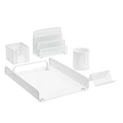 This desk accessories set is the perfect way to organizer your belongings. The white desk organizers and accessories can hold your paper, sticky notes, files, pens, pencils, and business cards! This set comes with 1 paper tray, 1 sticky notes holder, 1 file sorter, 1 pen cup, and 1 card stand; each will fit perfectly on your desk for easy organization