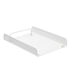 - Dimensions: The dimensions for the white desk accessories are as follows: Paper tray: 14 x 10 x 2 inches; file sorter: 6.75 x 3.25 x 5.5 inches; sticky notes holder: 3.85 x 3.85 x 3.25 inches;