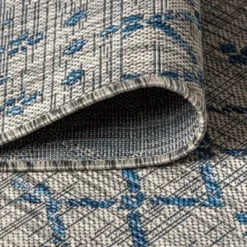 With its geometric design inspired by Moroccan patterns, our Boho-chic rug adds eclectic style to an outdoor porch or patio. Varied tones of gray and ivory mingled with a deep blue pattern give this rug a hand-woven, vintage vibe. The flatweave design is great for high-traffic spaces indoors too.