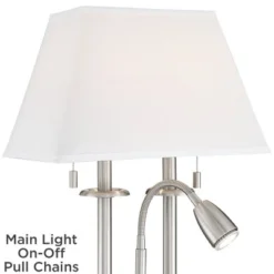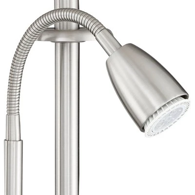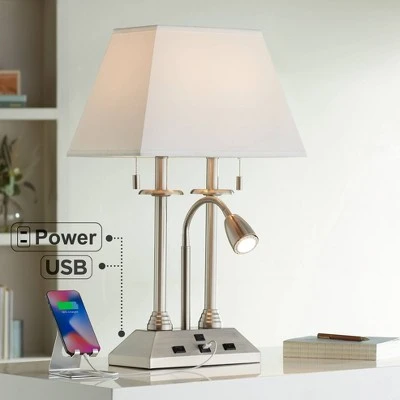 An elegant, contemporary look, this desk lamp adds convenience to any space. Featuring two outlets and a USB port, this lamp makes it easy for you to charge smart devices. It also comes with an LED gooseneck reading light. A beautiful brushed nickel finish completes the design.